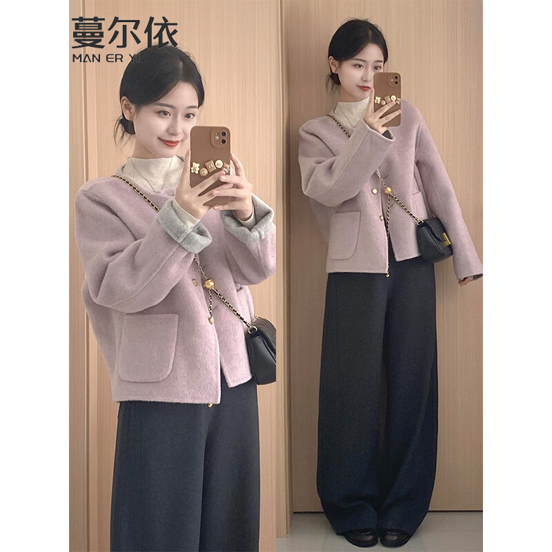 蔓尔依女装套装春秋2026新款韩系气质小香风两面穿毛呢外套休闲阔腿裤子 紫/灰两面穿外套+裤子+内搭 (三件套) S (建议105以下)