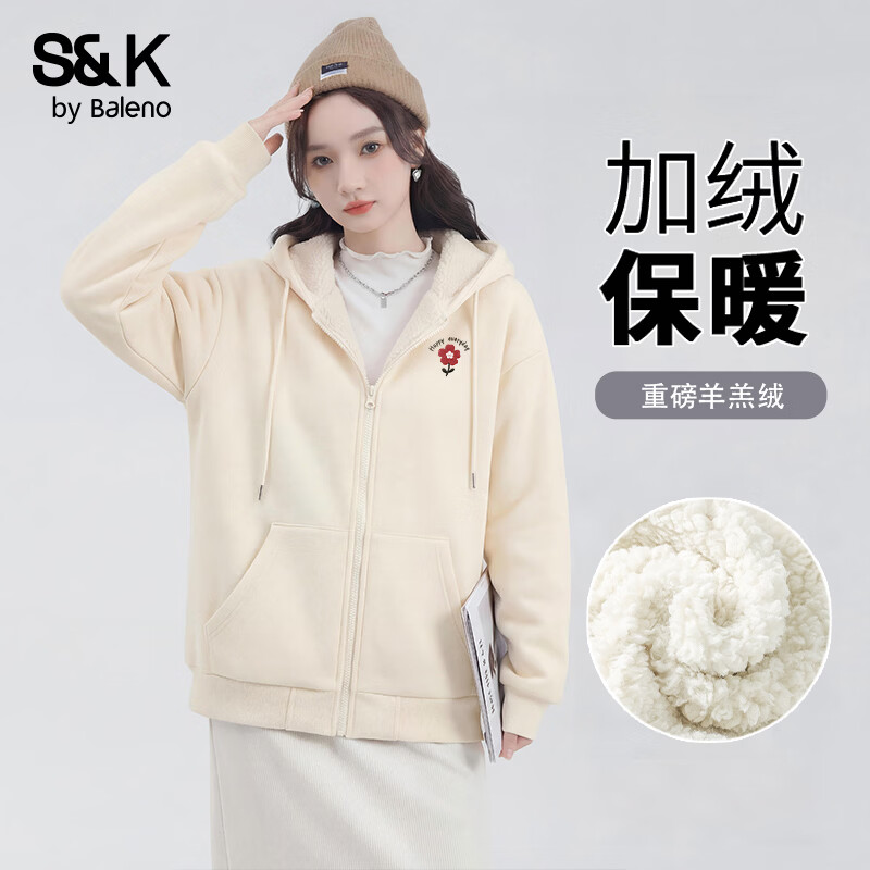 班尼路(Baleno)S&K系列加绒卫衣女装加厚保暖重磅羊羔绒套头连帽上衣服开衫外套 奶杏#红色花k 【开衫连帽卫衣】 M
