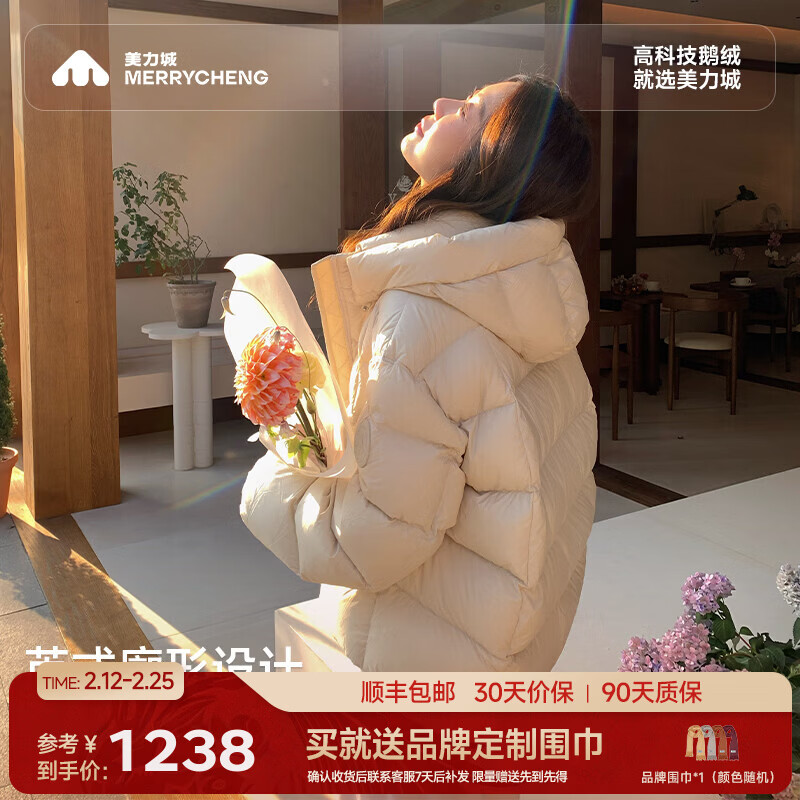 美力城【檀健次同款】长款羽绒服女装新款极地鹅绒外套时尚泡芙110 铂金白 S (100-110斤)